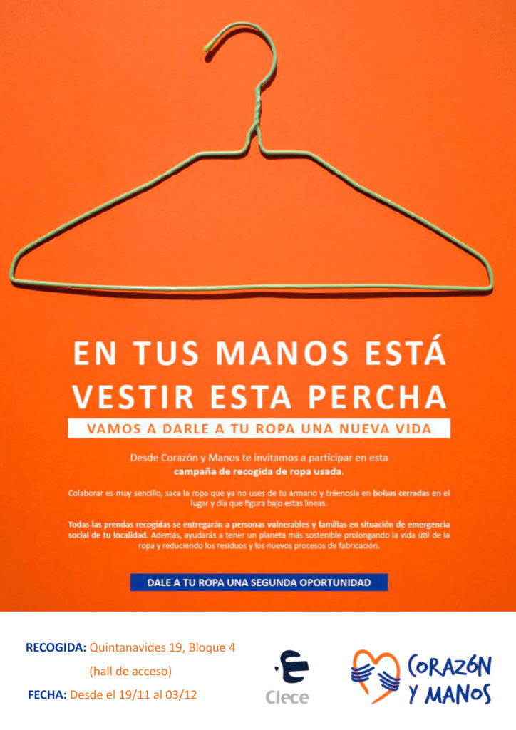 Merlin Hub participa desde hoy, 23 noviembre, y hasta el 10 de diciembre, en una campaña de recogida de ropa organizada por Grupo Clece y la Asociación Corazón y Manos.